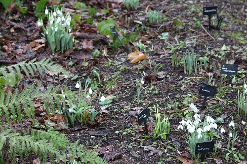 Little snowdrop hill at the end of the woodland with Lapwing in front, Wendy’s Gold to the left and Diggory to the left again.