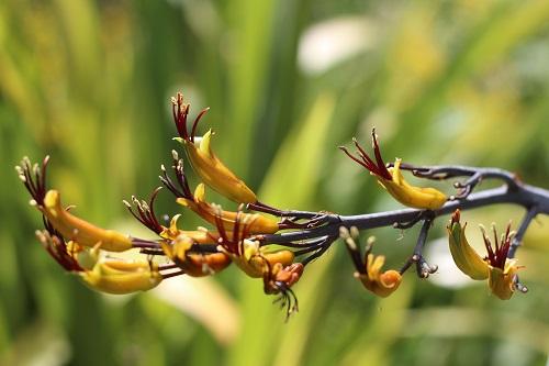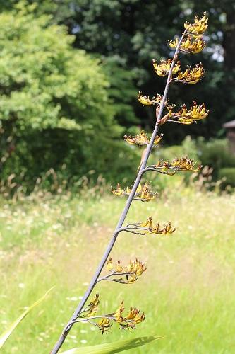 My second clump of Phormium Yellow Wave is up by the pond area and now flowering with its flower spikes much taller than me.