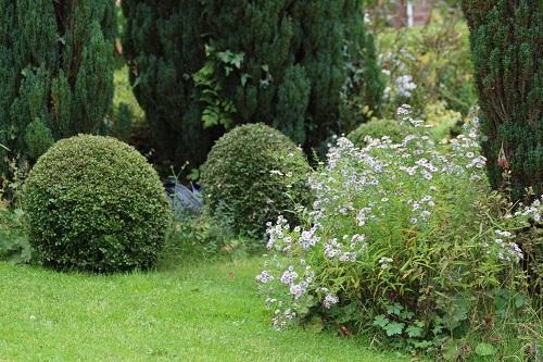 For a change, I’m showing the asters that seed around the garden. I like their frothiness which contrasts with the structure of my box balls.