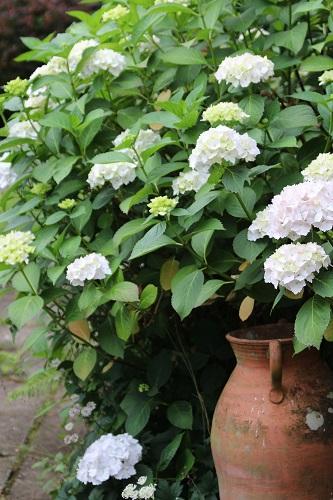 My white hydrangea under the kitchen window is now flowering and is another of the many Madames in the garden, this time H. Mme E. Mouillere.