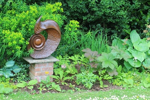 The right hand end of the border. The carving was made out of Sweet Chestnut and is very heavy, thank goodness I had a strong young man helping in the garden at the time to help me get it back on its plinth!