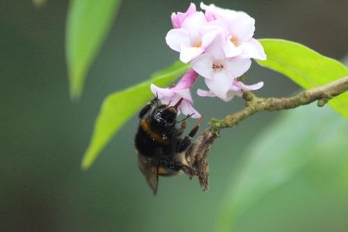 The perfume from Daphne bholua wafts through the woodland when the wind is from the west, a bumble bee got there before me!